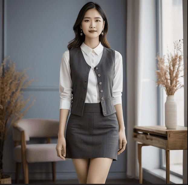 「現代都會西裝背心」採用俐落的剪裁與挺括面料,搭配偏灰的中性色調,展現專業且時尚的形象。獨特的斜排鈕扣設計打破傳統對稱感,增添一絲設計巧思與個性。搭配同色系短裙與白襯衫,營造出乾淨俐落的都會女性形象,特別適合商務簡報、面試或日常辦公場合穿著。
